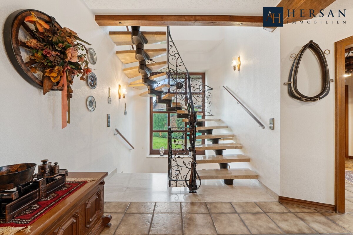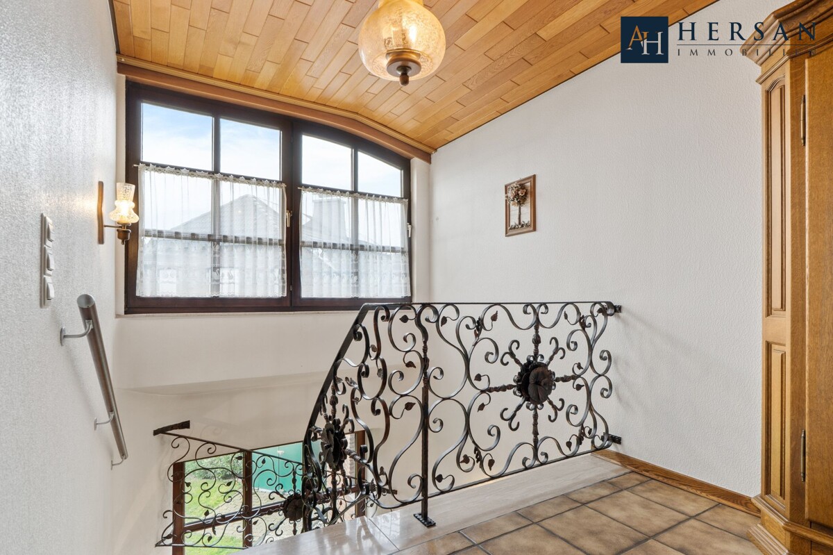 Zwei großzügige Balkone erweitern das Wohngefühl im Obergeschoss und bieten schöne Ausblicke in den Garten. Eine einzigartige Marmortreppe verbindet die Etagen und verleiht dem Haus einen eleganten Charakter.
