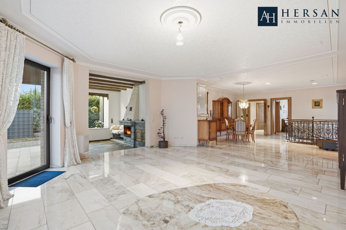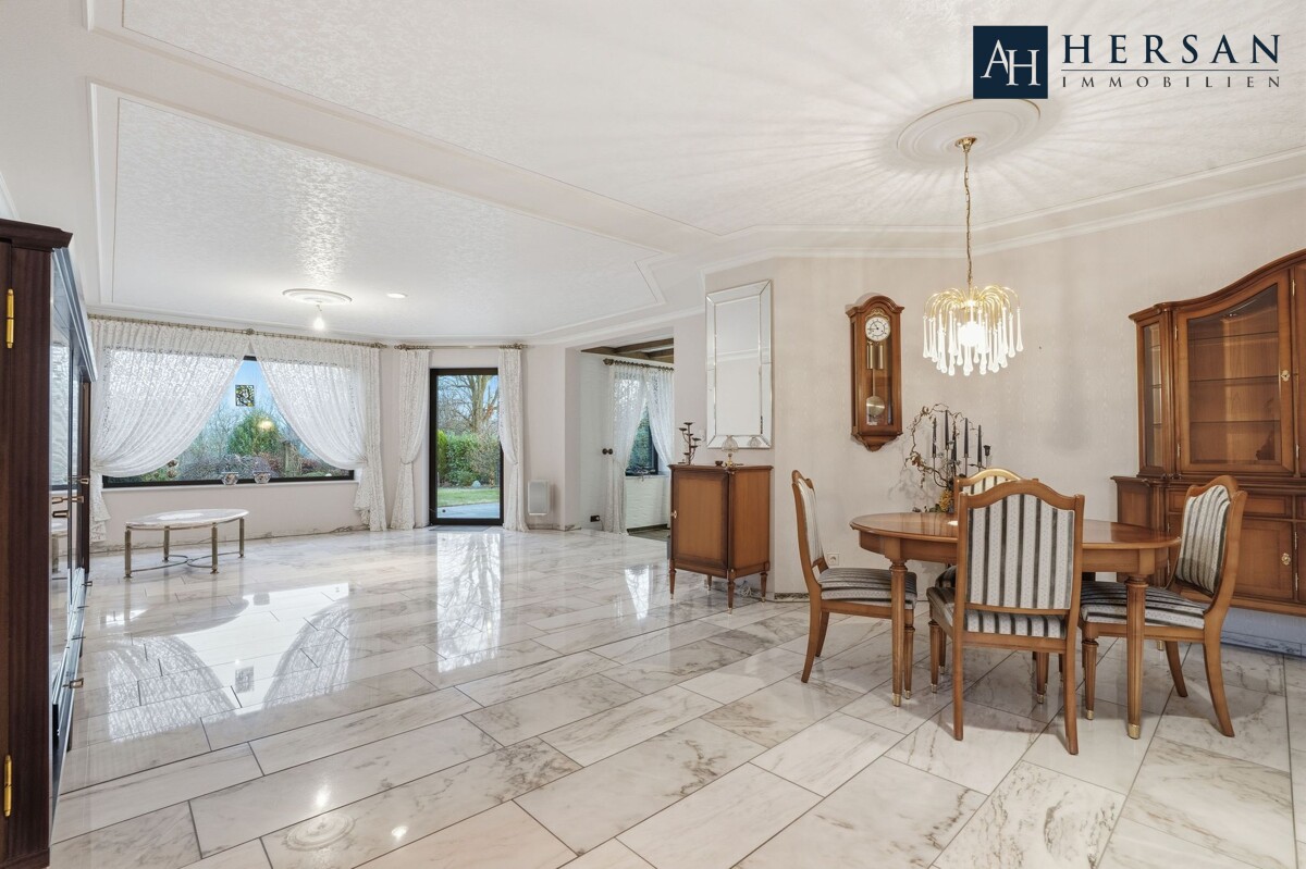 Der großzügige Wohn- und Essbereich bildet den Mittelpunkt des Hauses und bietet durch große Fensterflächen eine helle und freundliche Wohnatmosphäre. Ein angrenzendes Kaminzimmer sorgt für zusätzlichen Wohnkomfort und gemütliche Stunden.